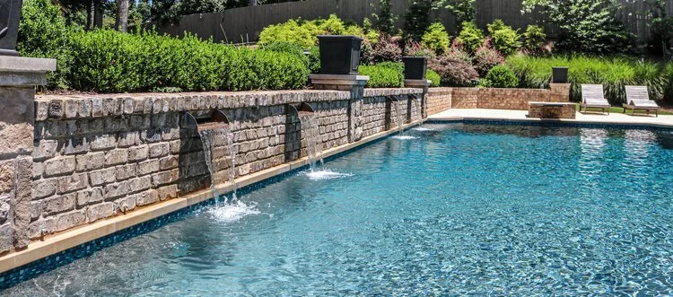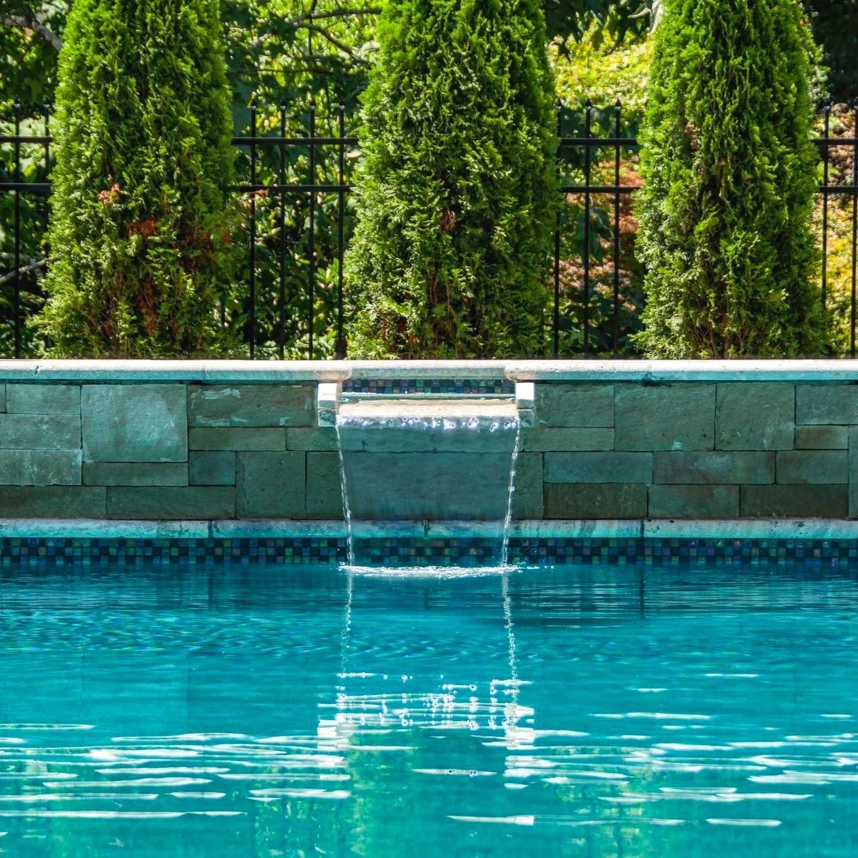 Sheer Descents are elegant water features that create a smooth, waterfall-like sheet of water adding a sleek design element to the pool’s design. These features are particularly popular for their calming sound and the serene ambiance they bring to any backyard oasis.